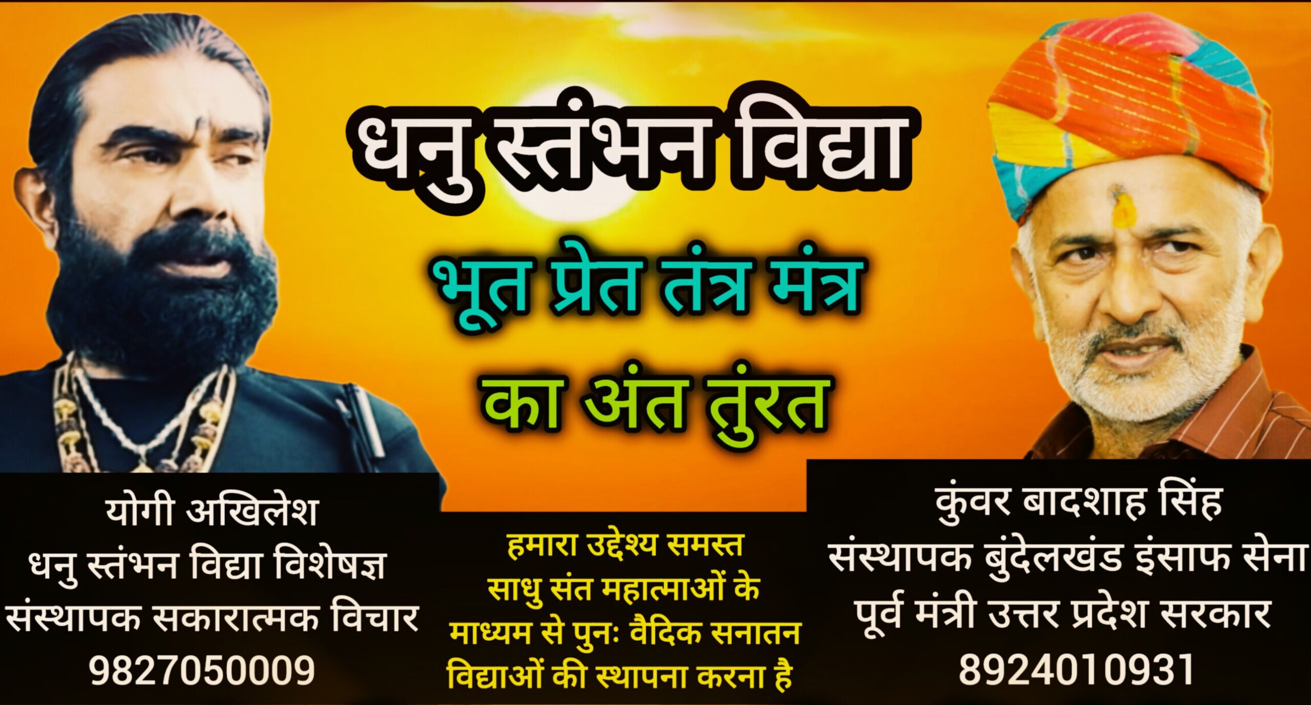 मेरा उद्देश्य तो सिर्फ इतना ही है कि ध्यान के पूर्व की धारणा आपके स्वयं की हो तभी समाधिस्थ शून्यता अर्थात परमात्मा के ज्ञान की प्राप्ती संभव है। मै तुम्हें ध्यान का मार्ग बतला सकता हूं परंतु गंतव्य तक पहुँचने के लिए तुम्हें स्वयं ही चलना होगा क्यों की मै ईश्वर से मिलवाने वाला कोई बिचोलिया या गुरु नहीं परंतु आपका पथ प्रदर्शक अवश्य बन सकता हूं। " धनु स्तंभन" योग विद्या एक ऐसी विधि है जिसके माध्यम से मनुष्य अन्य के भूत प्रेत तंत्र मंत्र जैसी समस्याओं से मुक्ति प्रदान कराने वाला एवं स्वयं ध्यान, धारणा और समाधि द्वारा ईश्वर ईश्वर तत्व को प्राप्त करने वाला बनता है। ॐ